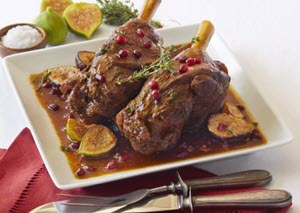 Lamb shanks slow braised in a tangy and sweet sauce with pomegranate juice and figs creates a show-stopping main dish perfect for the holidays.